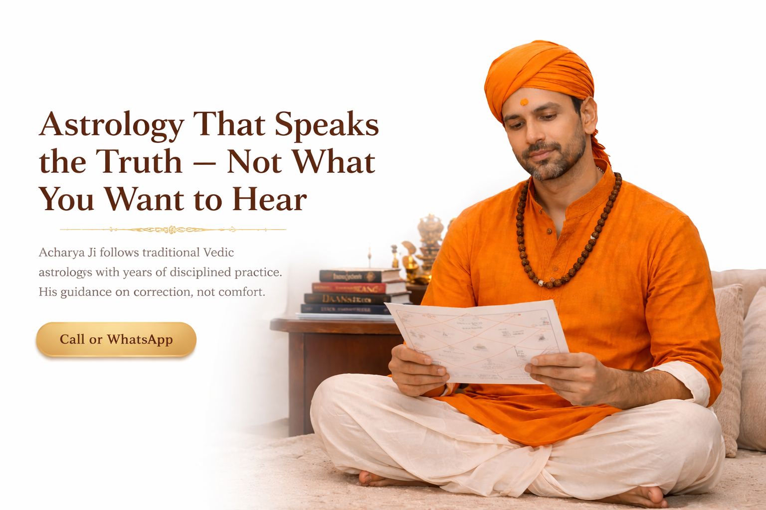 Acharya Ji has spent years studying and practicing Vedic astrology with discipline and patience. His work focuses on understanding the root cause of life problems — not temporary comfort.
